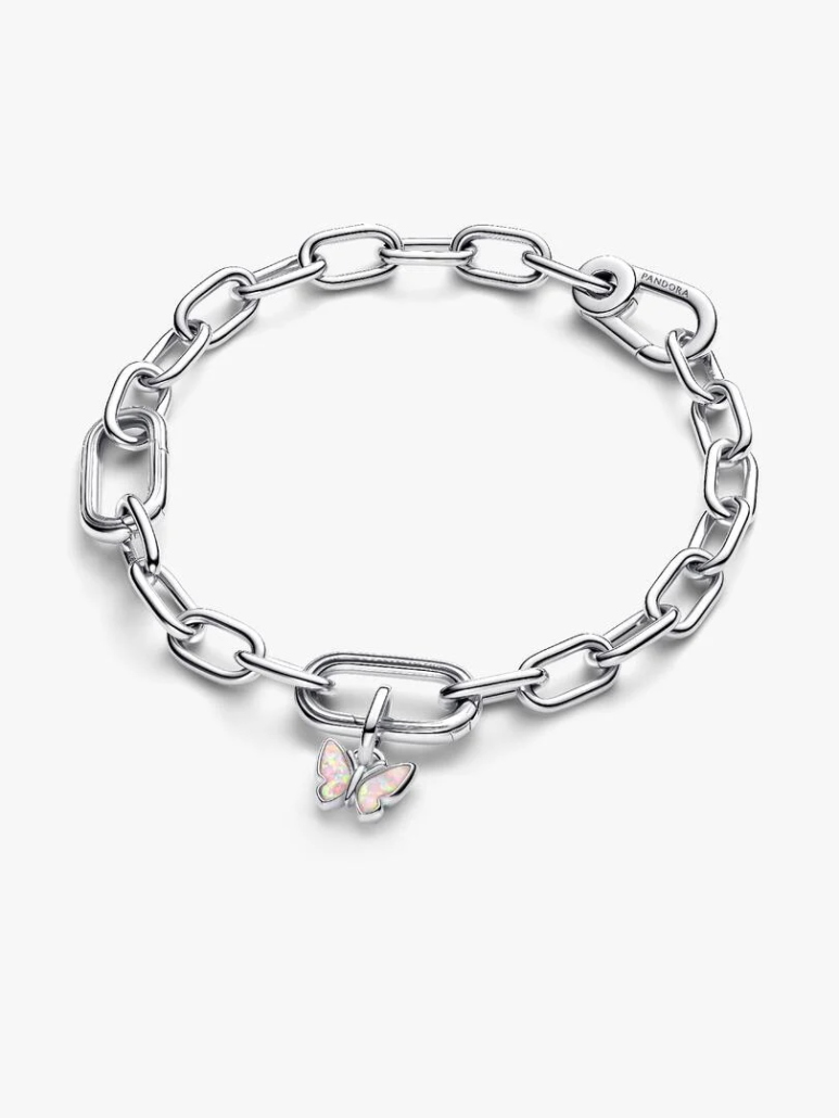 Deja volar tus sueños. Nuestro charm mini colgante de una mariposa en plata de primera ley brilla con el ópalo rosa creado en laboratorio que la decora, mientras que los detalles de estrellas y líneas en la parte inferior de sus alas le aportan un toque de magia inspirada en la naturaleza.